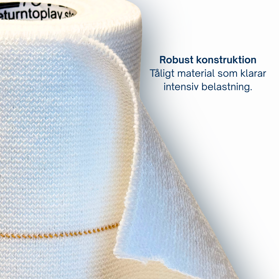 Elastisk självhäftande tejplinda utformad för att ge stadigt stöd åt ledband och leder efter en skada. Vanligt använd av idrottare vid akuta skador som kräver extra förstärkning för att kunna fortsätta spela. Den unika gula mittlinjen gör det enkelt att justera och applicera bindan korrekt, vilket gör den till en pålitlig lösning för skadehantering direkt på planen.